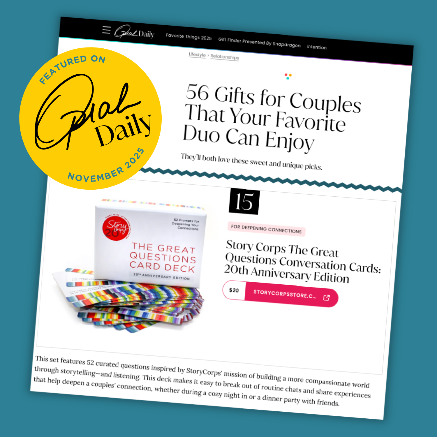 Featured in Oprah Weekly's "56 Gifts for Couples That Your Favorite Duo Can Enjoy"!